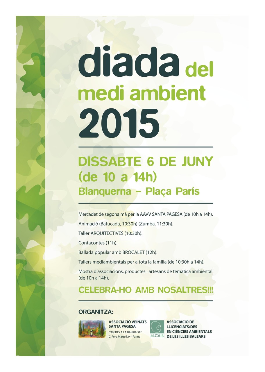 El passat dissabte dia 6 de juny, celebràrem un any més el DIA DEL MEDI AMBIENT amb una gran diada al carrer Blanquerna on convidarem a empreses, associacions, entitats i particulars relacionats amb el món del medi ambient per mostrar a la gent de Palma i de tota Mallorca la gran quantitat d'iniciatives que es duen a terme en qüestions ambientals.